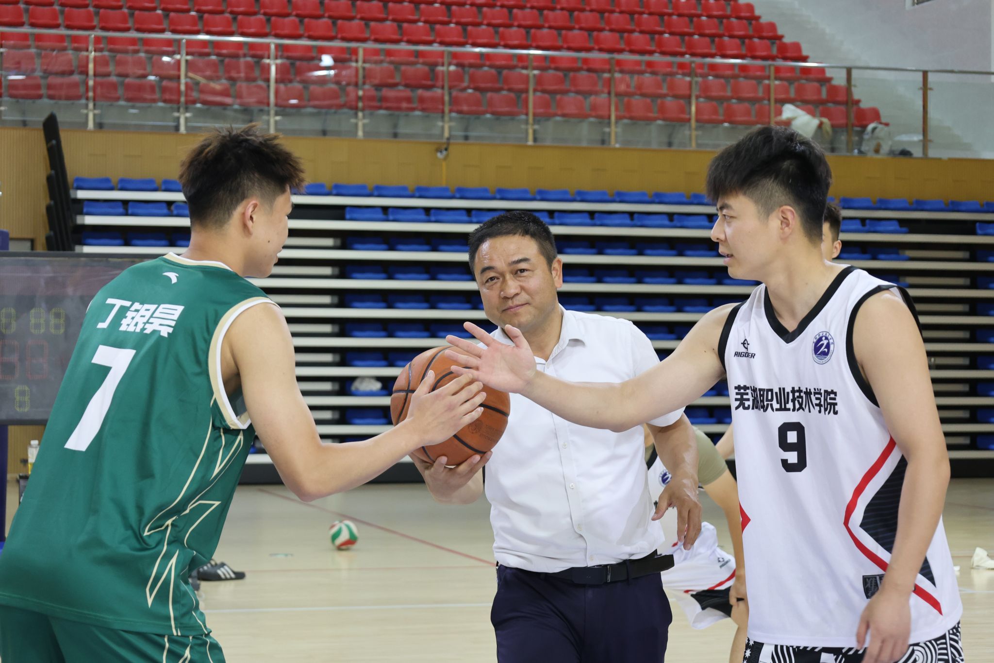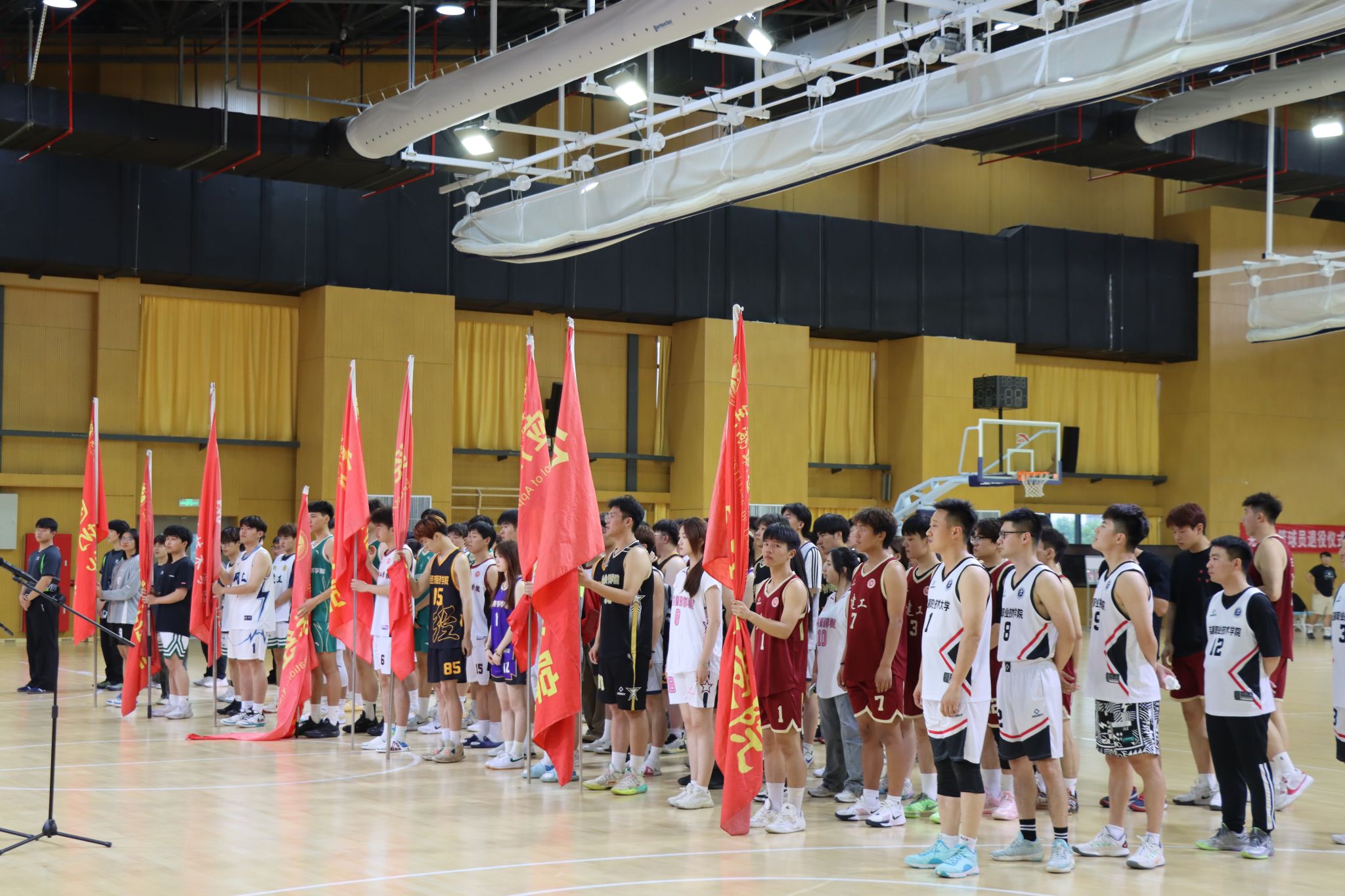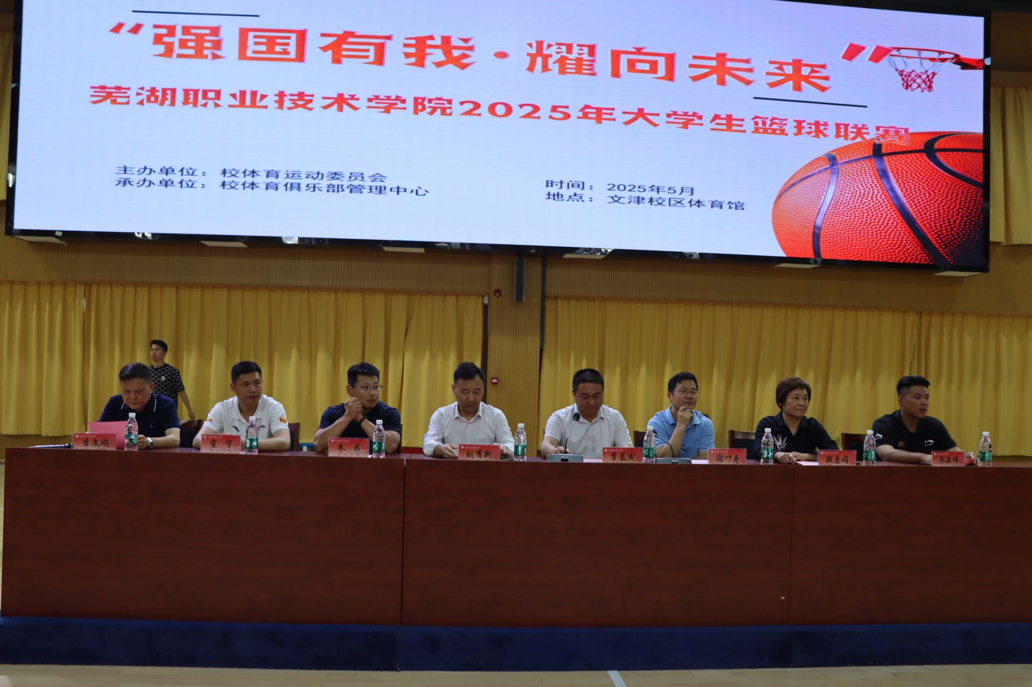 为推动学生体质强健计划实施,展现我校体育工作成效,带动广大师生走下网络、走出宿舍、走向操场,增强体质、健全人格、锤炼意志,5月7日晚六点,由校体委主办,体育俱乐部管理中心承办,篮球俱乐部协办的“强国有我·耀向未来”芜湖职业技术学院2025年大学生篮球联赛,在文津校区篮球馆开幕。校党委委员、副校长季慕寅,安徽工程大学体育学院副院长谢叶寿、校团委书记刘有新、体育教学部副主任殷惠娟、朱磊出席开幕式。